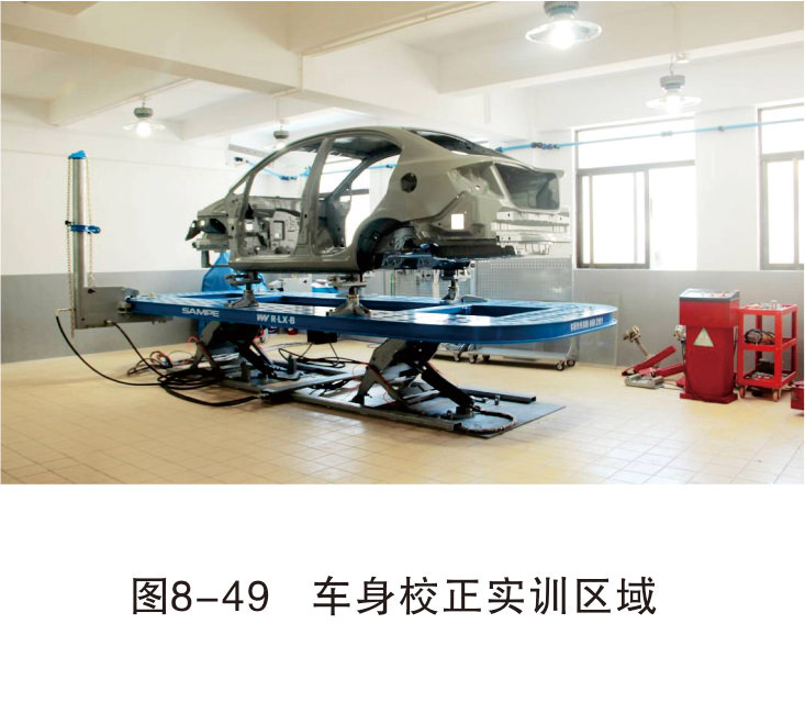 損傷修復和焊接作業區域可各設置 4~6個工位,每個工位的面積約400cm×800cm,每個工位配相應的設備和操作臺(架)。車身校正作業一般設一個工位,面積500cm×800cm。如條件允許,可以根據不同類型的校正架,設置2~3個工位。